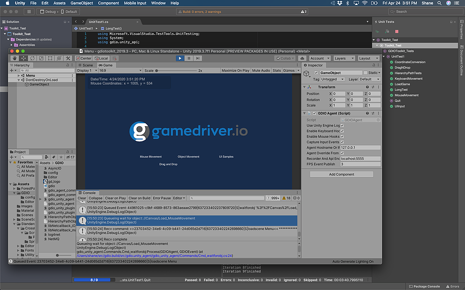 The new version of GameDriver includes macOS support and the GameDriver Agent and API for Unity 2018.4 LTS and Unity 2019.x.